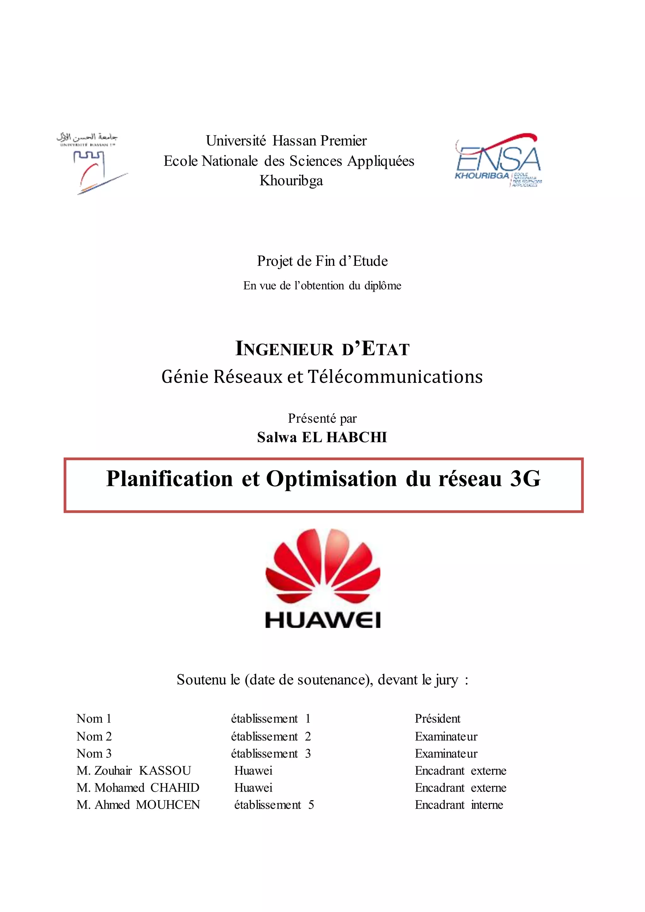 Le projet de fin d'études de Salwa El Habchi vise à optimiser le réseau 3G de Méditel à Chaouen, en se concentrant sur la planification et l'amélioration des performances en matière de qualité de service, de couverture et de débit. L'optimisation est essentielle pour garantir la rentabilité des services offerts aux abonnés, répondant à leurs exigences élevées de qualité. Le rapport présente des outils et méthodes développés pour détecter et analyser les problèmes sur l'interface radio, ainsi qu'une procédure d'optimisation appliquée à la région étudiée.