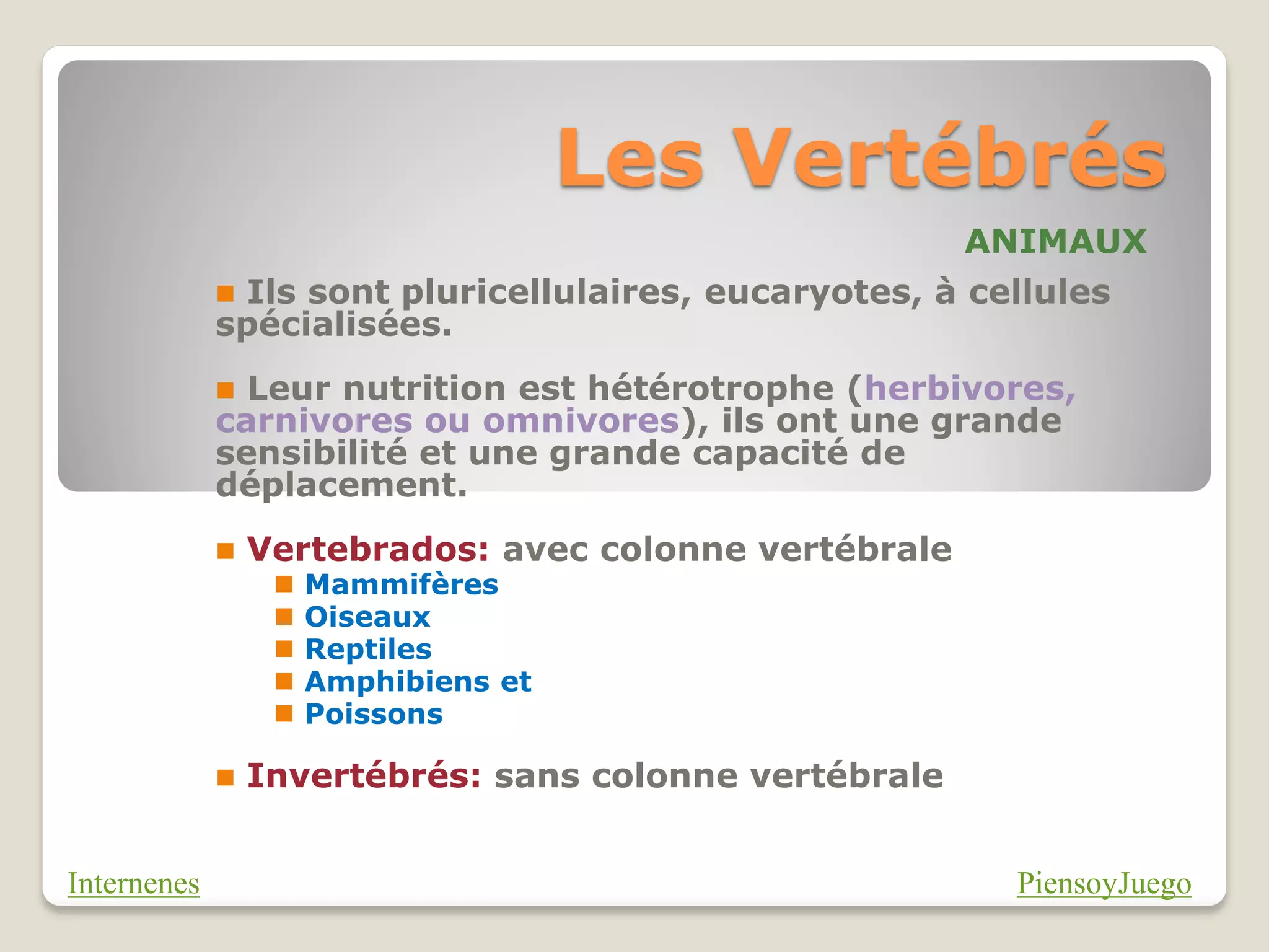 Les vertébrés sont des animaux eucaryotes, pluricellulaires avec une colonne vertébrale, incluant les mammifères, oiseaux, reptiles, amphibiens et poissons. Ils se caractérisent par un corps divisé en trois parties, des extrémités articulées, un système nerveux développé, et une symétrie bilatérale. Chaque groupe de vertébrés possède des adaptations spécifiques, comme les mammifères qui sont vivipares et homéothermes, tandis que les reptiles sont ovipares et poïkilothermes.