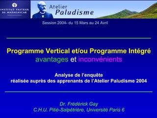 Ce document présente une analyse des avantages et inconvénients des programmes de santé verticaux par rapport aux programmes intégrés, basée sur une enquête réalisée auprès des participants d'un atelier sur le paludisme en 2004. Les résultats montrent des différences significatives dans la gestion des ressources, l'organisation, et l'efficacité, chaque modèle ayant ses propres forces et faiblesses. La discussion souligne le besoin d'une approche intégrée tout en reconnaissant les avantages d'une approche verticale pour certaines situations.