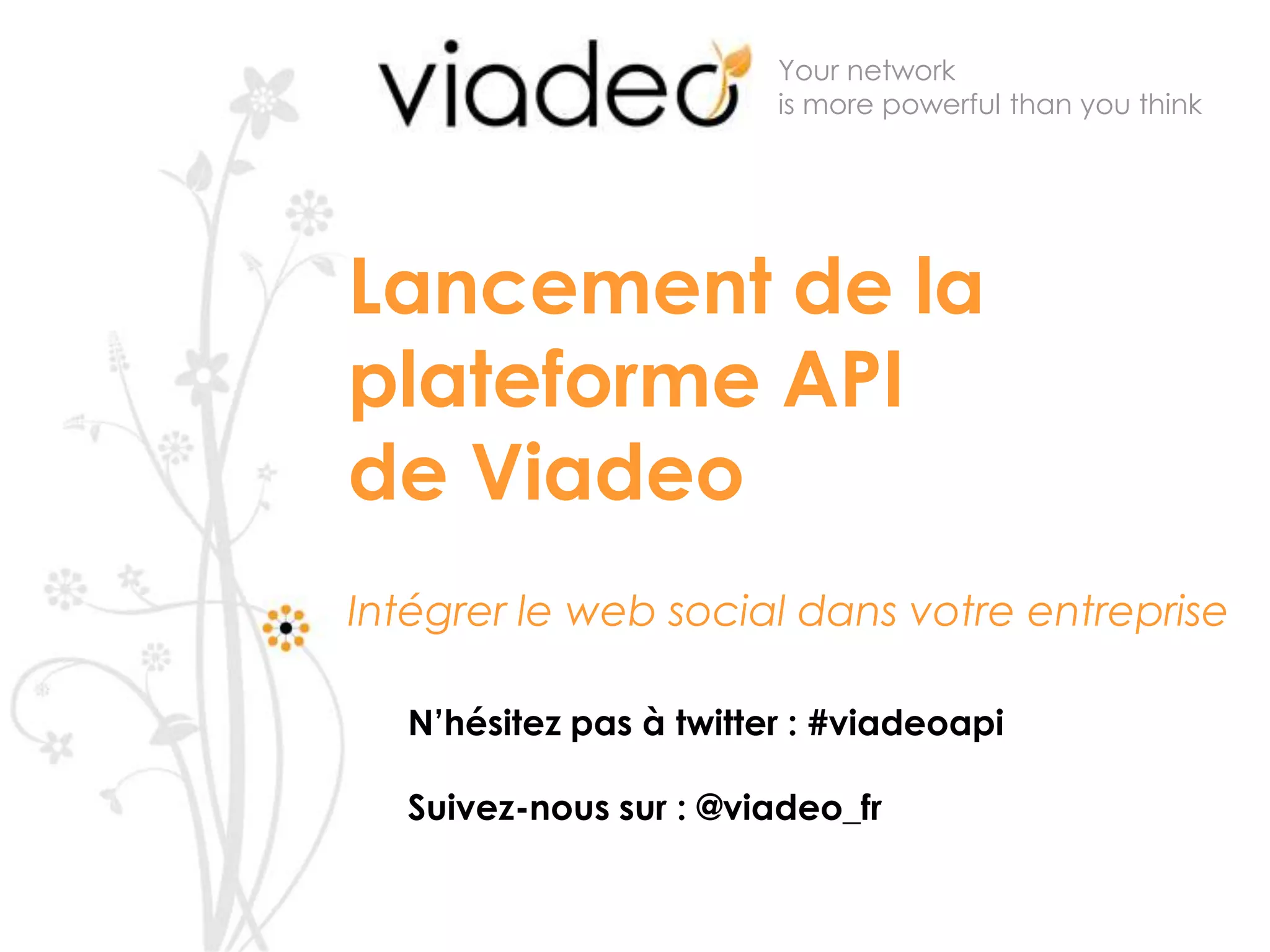 Le document annonce le lancement de la plateforme API de Viadeo, visant à intégrer le web social dans les entreprises. Il souligne les avantages d'utiliser des APIs pour étendre les canaux de distribution et améliorer l'engagement des utilisateurs. Des collaborations stratégiques avec Salesforce et des détails sur des intégrations spécifiques sont également mentionnés.