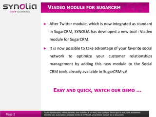 Le module Viadeo pour SugarCRM permet d'intégrer ce réseau social dans la gestion des relations clients. Il offre des fonctionnalités telles que la connexion à des comptes, l'importation de contacts et l'accès à des mises à jour. Ce module vise à améliorer la connaissance client et à développer le réseau professionnel des utilisateurs.