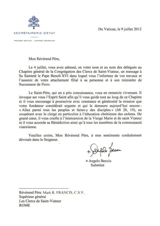Le 14 juillet 2012, le p. Alain Ambeault a été élu supérieur général lors du 29e chapitre général de la congrégation viatorienne, qui a également vu l'élection d'un nouveau conseil général. Ce chapitre a été une occasion de renouveau et de célébration de la mission viatorienne, mettant en lumière l'engagement des membres envers l'évangile et leur responsabilité de servir les plus défavorisés. Les participants ont été encouragés à se mobiliser autour des priorités de pastorale vocationnelle et de justice sociale dans les années à venir.