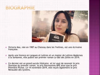 Le bal des folles est un roman de Victoria Mas, centré sur l'hôpital de la Salpêtrière à la fin du 19ème siècle, où le docteur Charcot étudie l'hystérie. À travers l'histoire d'Eugénie, une jeune fille dotée de capacités extraordinaires, le livre dénonce le machisme de l'époque et remet en question la définition de la folie. Évalué positivement pour sa prose fluide et ses thèmes puissants, le roman a également été adapté au cinéma par Mélanie Laurent.