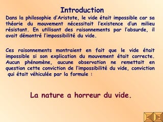 Le document traite de l'évolution des idées sur le vide, en commençant par Aristote qui niait son existence, suivi des expériences menées par Galilée, Torricelli et Pascal qui ont questionné et testé cette notion. À travers plusieurs expériences, notamment celles de Torricelli et de Pascal, il est démontré que la pression atmosphérique joue un rôle crucial dans la compréhension du comportement des liquides et du vide. Finalement, ces expériences remettent en question les croyances anciennes et ouvrent la voie à une meilleure compréhension des phénomènes physiques liés au vide.