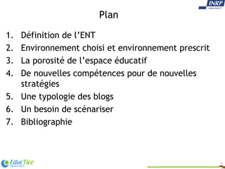 Le document traite des espaces numériques de travail (e.n.t.), qui sont des environnements en ligne destinés à la communauté éducative, permettant l'accès à des ressources pédagogiques et le suivi de la vie scolaire. Il souligne l'importance de l'interopérabilité et de la modularité des outils utilisés dans les e.n.t. pour répondre aux besoins évolutifs du système éducatif. Enfin, il évoque la nécessité de compétences variées pour utiliser et gérer efficacement ces espaces numériques.