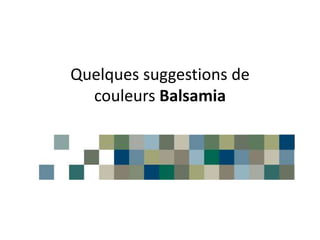 Les inspirations Balsamia se caractérisent par des teintes de bleu et de vert évoquant le calme des environnements boisés. Elles offrent une palette de couleurs suggérées pour créer une atmosphère apaisante. Ces nuances sont idéales pour des designs naturels et sereins.
