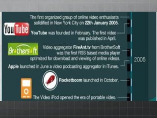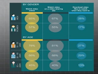 Le document explore l'évolution et les pratiques sociales liées à la vidéo en ligne, en mettant en avant les changements survenus depuis la première vidéo sur YouTube en 2006. Il souligne l'individualisation de la consommation, la complémentarité entre la vidéo en ligne et la télévision, ainsi que les nouveaux modèles de monétisation qui émergent dans le paysage numérique. Les réseaux sociaux jouent un rôle clé dans le partage de contenus vidéo, contribuant à une surabondance d'offres et à la création de communautés virtuelles.
