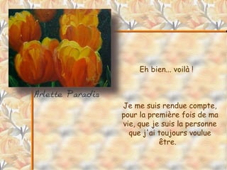 L'auteur exprime sa satisfaction d'être devenue la personne qu'elle a toujours voulu être, en mettant l'accent sur l'importance de la beauté intérieure et des relations authentiques. Elle partage sa gratitude pour la vie, malgré les épreuves, et prône une attitude positive et généreuse. Vieillir est perçu comme un cadeau, avec la possibilité de récolter les fruits de ses choix passés et de vivre avec plus de liberté et de joie.