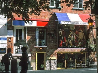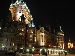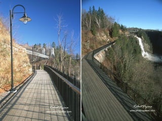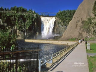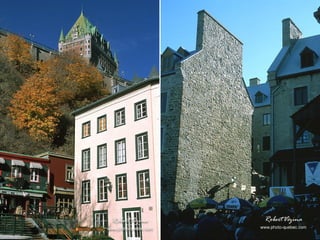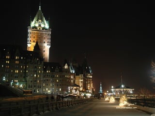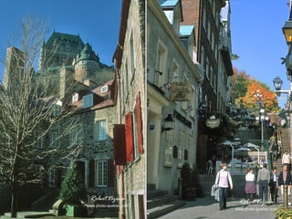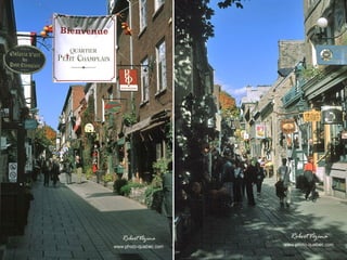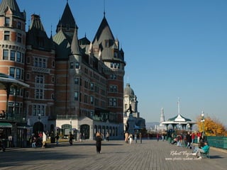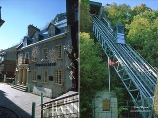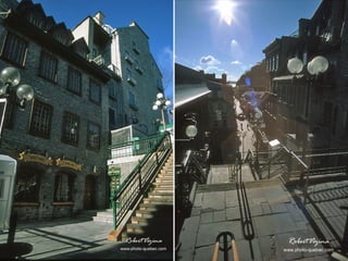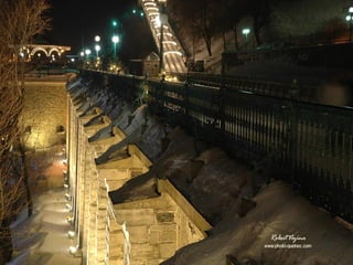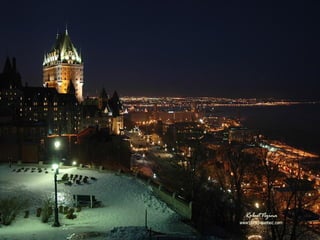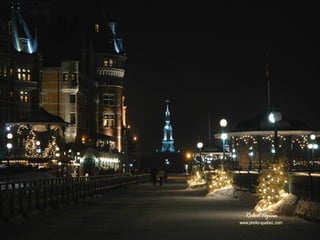 Le document évoque des lieux emblématiques de la région de Québec, tels que le Vieux-Québec, les chutes de Montmorency et le parlement. Il mentionne également des éléments pittoresques comme la rue du Petit Champlain et la terrasse du château. Un thème musical, 'Twilight Time' par Francis Goya, accompagne cette exploration des sites.