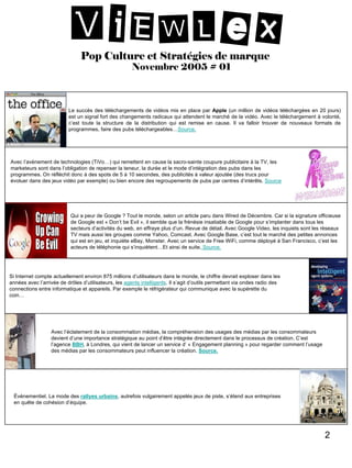 Le document traite des stratégies de marketing innovantes et des tendances dans l'industrie de la musique et de la publicité. Il mentionne des événements marquants, comme un concert surprise de Shakira, et souligne l'impact de la technologie sur la consommation de médias, notamment avec Tivo et les téléchargements de vidéos. De plus, il aborde la montée de Google et son influence sur divers secteurs, ainsi que les nouvelles attentes des consommateurs face à la publicité.