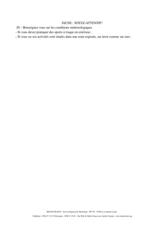 Le bulletin de suivi n°1 pour la Martinique annonce un épisode de vigilance jaune en raison d'une houle dangereuse prévue à partir du 12 février 2015 à 20h locales. Cette houle, avec des vagues de 0,60 à 1 mètre, affectera principalement la côte caraïbe et le nord de l'île, en particulier les plages du Carbet et la route le long de l'Anse Turin. Les habitants sont conseillés de se renseigner sur les conditions météorologiques et d'éviter les zones exposées aux risques côtiers.
