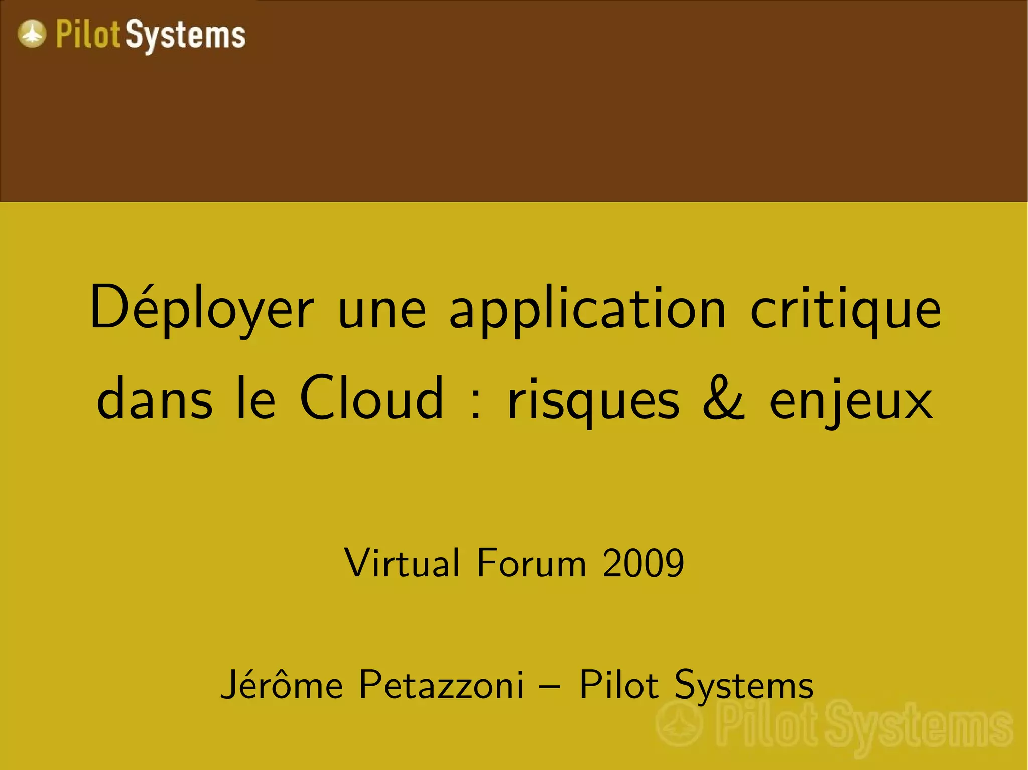 Le document explore les avantages et inconvénients du déploiement d'applications critiques dans le cloud, en mettant l'accent sur la dépendance envers les fournisseurs et les risques associés à la sécurité des données. Il souligne la nécessité d'une relation de confiance avec les fournisseurs de matériel et de logiciels, ainsi que l'importance d'une interopérabilité entre les systèmes. Enfin, il conclut sur le fait que, malgré les inconvénients, l'utilisation du cloud est en augmentation, mais s'accompagne de défis de choix et de migration complexes.