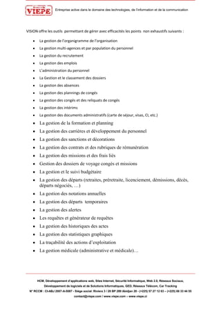 Viepe est une entreprise spécialisée dans le développement de solutions informatiques, notamment dans la gestion des ressources humaines (HCM) à travers un logiciel puissant et adaptable. Ce logiciel multi-utilisateur permet une gestion efficace des employés, des documents et des processus administratifs tout en intégrant des normes de sécurité et de convivialité. Avec des fonctionnalités variées allant de la gestion des carrières à la traçabilité des actions, Viepe propose une solution flexible pour les entreprises et les états.