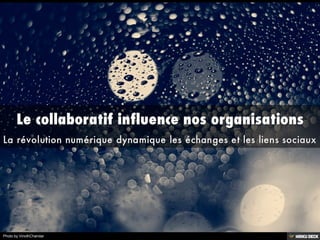 Le document traite de l'impact de la transformation numérique et du collaboratif sur les organisations. Il aborde des thèmes tels que l'innovation collaborative, la gestion du cycle de vie des produits et la dématérialisation des procédures. Enfin, il souligne l'importance des plateformes collaboratives pour favoriser les échanges et les liens sociaux entre les collaborateurs.