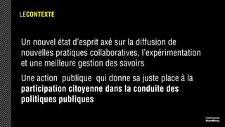Le document présente un projet visant à mobiliser les acteurs du territoire autour d'une vision métropolitaine partagée, en intégrant des pratiques collaboratives et la participation citoyenne. Il propose la création d'un réseau social basé sur l'image pour recueillir diverses perceptions du territoire tout en encourageant une démarche de co-construction. L'approche privilégie l'expérimentation et la collaboration, en permettant aux acteurs de s'engager progressivement dans le processus participatif.