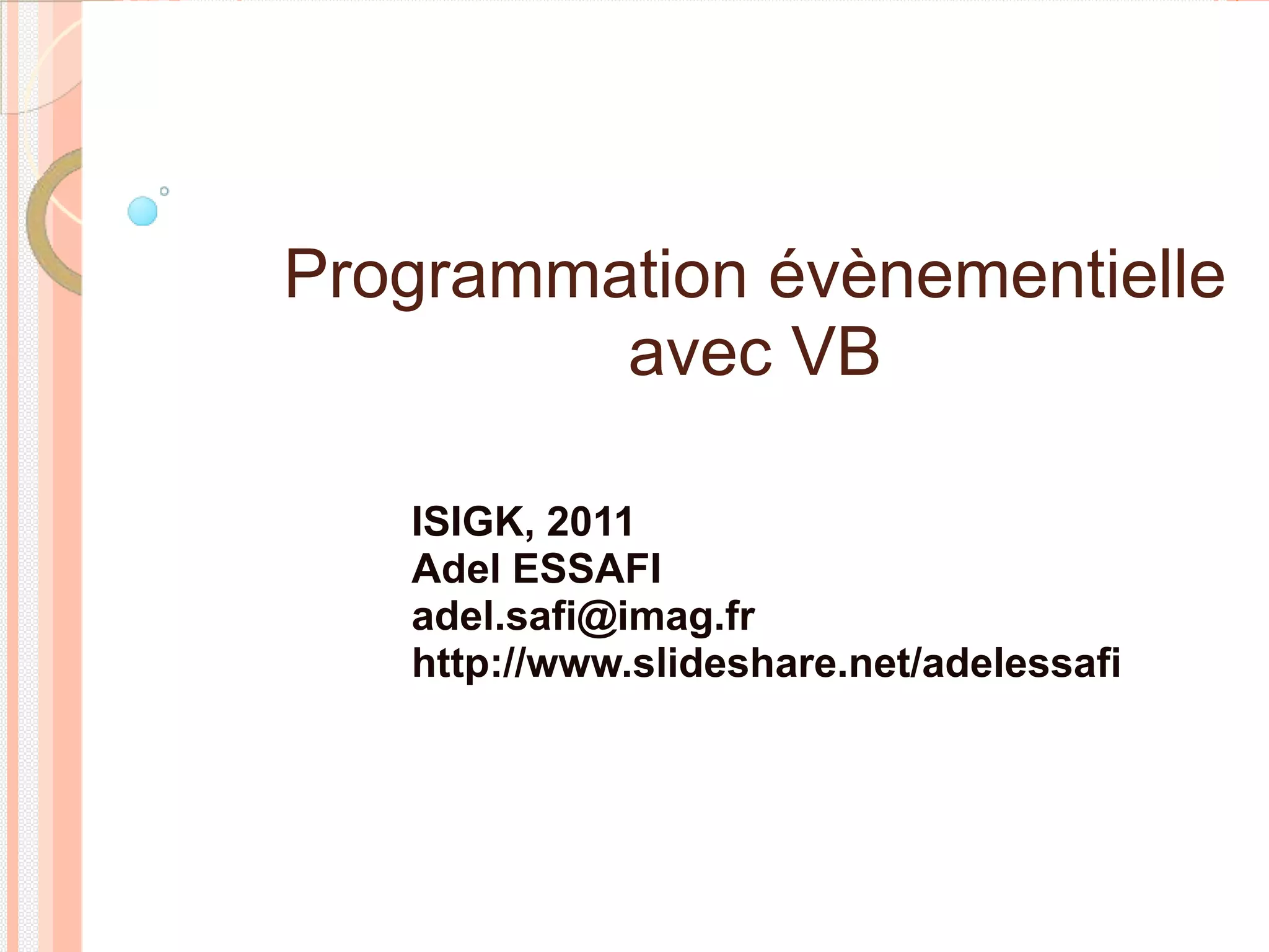 Le document présente un cours sur la programmation événementielle avec Visual Basic, en incluant des notions de base sur les structures de données, les procédures, les fonctions, ainsi que l'évolution des langages de programmation. Il détaille également les éléments fondamentaux de Visual Basic, tels que les formulaires, les contrôles de base et les collections, ainsi que des exemples de code. Enfin, le document aborde la création d'interfaces utilisateurs et les types de contrôles communs dans Visual Basic.