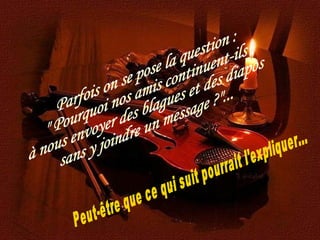 L'auteur s'interroge sur l'envoi de blagues et de diaporamas sans message par des amis, expliquant que cela peut être un moyen de maintenir le contact en période de forte occupation. Ces envois symbolisent des pensées amicales et un désir de faire sourire, témoignant de l'importance de la communication à travers Internet. La technologie facilite ainsi l'entretien des relations malgré les distances.