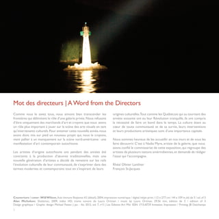 Le document présente une exposition d'art contemporain autochtone, mettant en lumière la relation des artistes avec leur culture, leur langue et leur territoire dans un contexte colonial. Curatée par Nadia Myre, l'exposition explore comment une nouvelle génération d'artistes redéfinit l'identité et conteste l'assimilation à travers diverses œuvres. Les artistes utilisent des stratégies variées pour affirmer leur présence et examiner les enjeux du langage et du territoire au sein de leur pratique artistique.