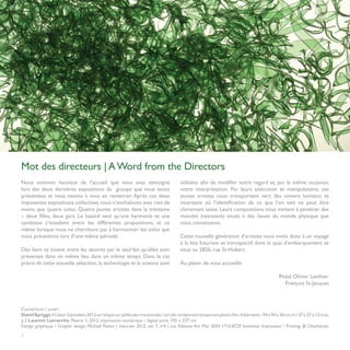 Ce document présente des expositions d'art contemporain mettant en vedette quatre jeunes artistes, Nadia Myre, Magalie Comeau, Laurent Lamarche et David Spriggs, dont les œuvres explorent des thèmes futuristes et introspectifs. Les artistes sont remerciés pour leur contribution, et des textes de plusieurs auteurs accompagnent leurs travaux, soulignant les nuances et la profondeur de leur art. L'événement se déroule du 3 mars au 21 avril 2012 au 5826, rue St-Hubert à Montréal.