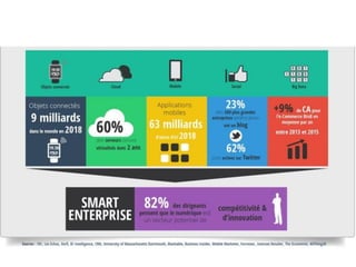 Le document présente la nécessité d'une plateforme collaborative pour améliorer l'innovation, la croissance et la productivité en intégrant des technologies comme le cloud, l'analytique, et la mobilité. Il souligne les défis posés par des systèmes informatiques trop couplés, appelés 'syndrome du plat de spaghettis', qui rendent l'entretien coûteux. En mettant l'accent sur des applications mobiles et une entreprise connectée, il vise à répondre aux attentes des clients et collaborateurs modernes.