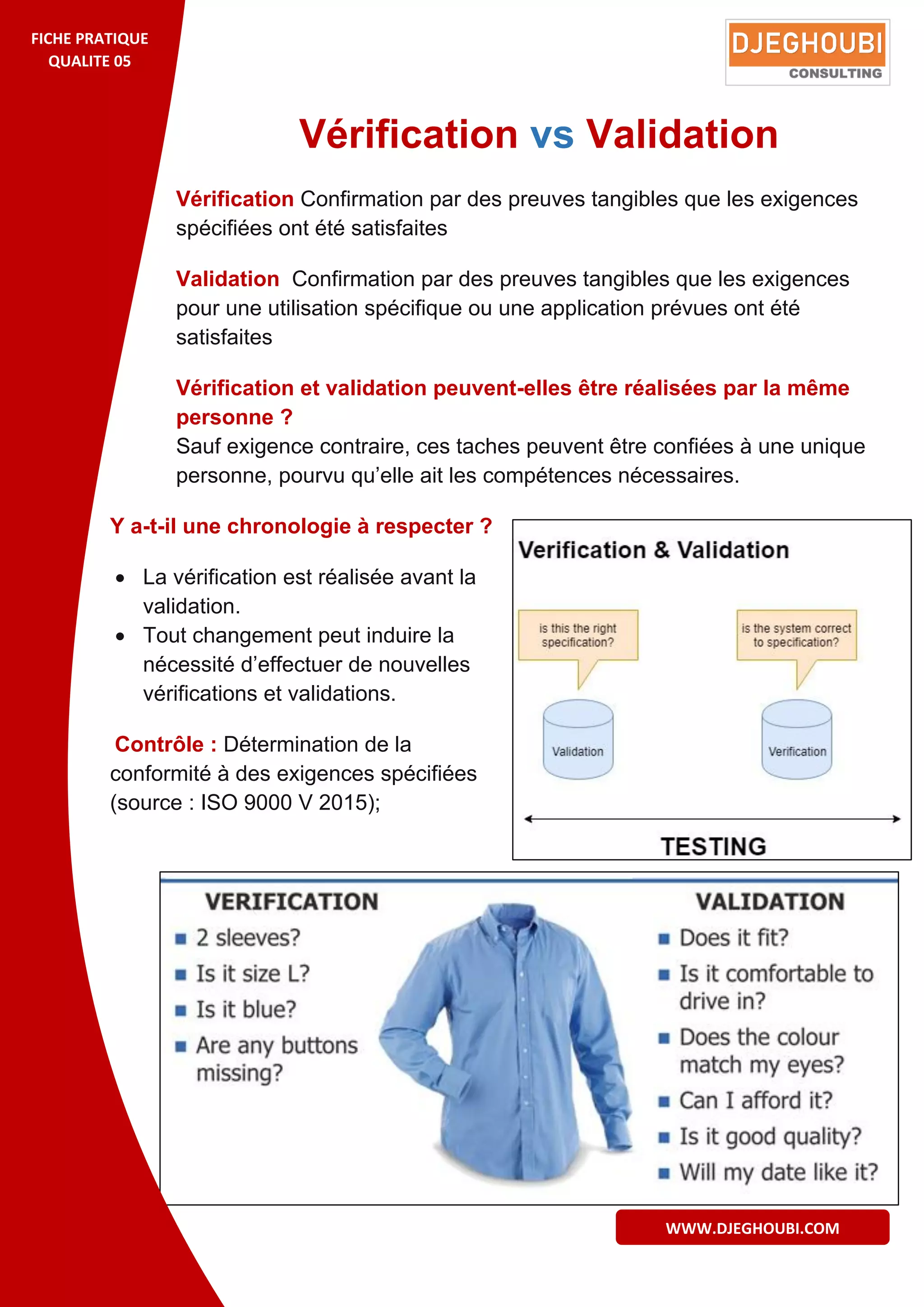 La vérification confirme que les exigences spécifiées sont satisfaites, tandis que la validation assure que celles-ci répondent à des usages ou applications prévues. Les tâches de vérification et de validation peuvent, sauf exigence contraire, être réalisées par la même personne si elle possède les compétences nécessaires, avec la vérification devant être effectuée avant la validation. Tout changement peut nécessiter de nouvelles vérifications et validations.
