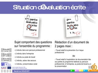 Le document décrit le contrôle durant la formation CAP en matière de vie sociale et professionnelle. Il comprend une évaluation écrite de deux parties, chacune d'une heure, ainsi qu'un travail de rédaction sur la prévention des risques professionnels ou l'exploitation de documentation relative au programme. Des critères d'évaluation et des consignes spécifiques pour la rédaction du document final sont fournis.