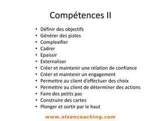Le document présente des compétences essentielles pour le coaching, notamment la définition d'objectifs, la création de relations de confiance et l'externalisation. Il souligne l'importance de permettre au client de prendre des décisions et d'agir par étapes. Divers outils et méthodes pour encadrer le processus de coaching sont également mentionnés.