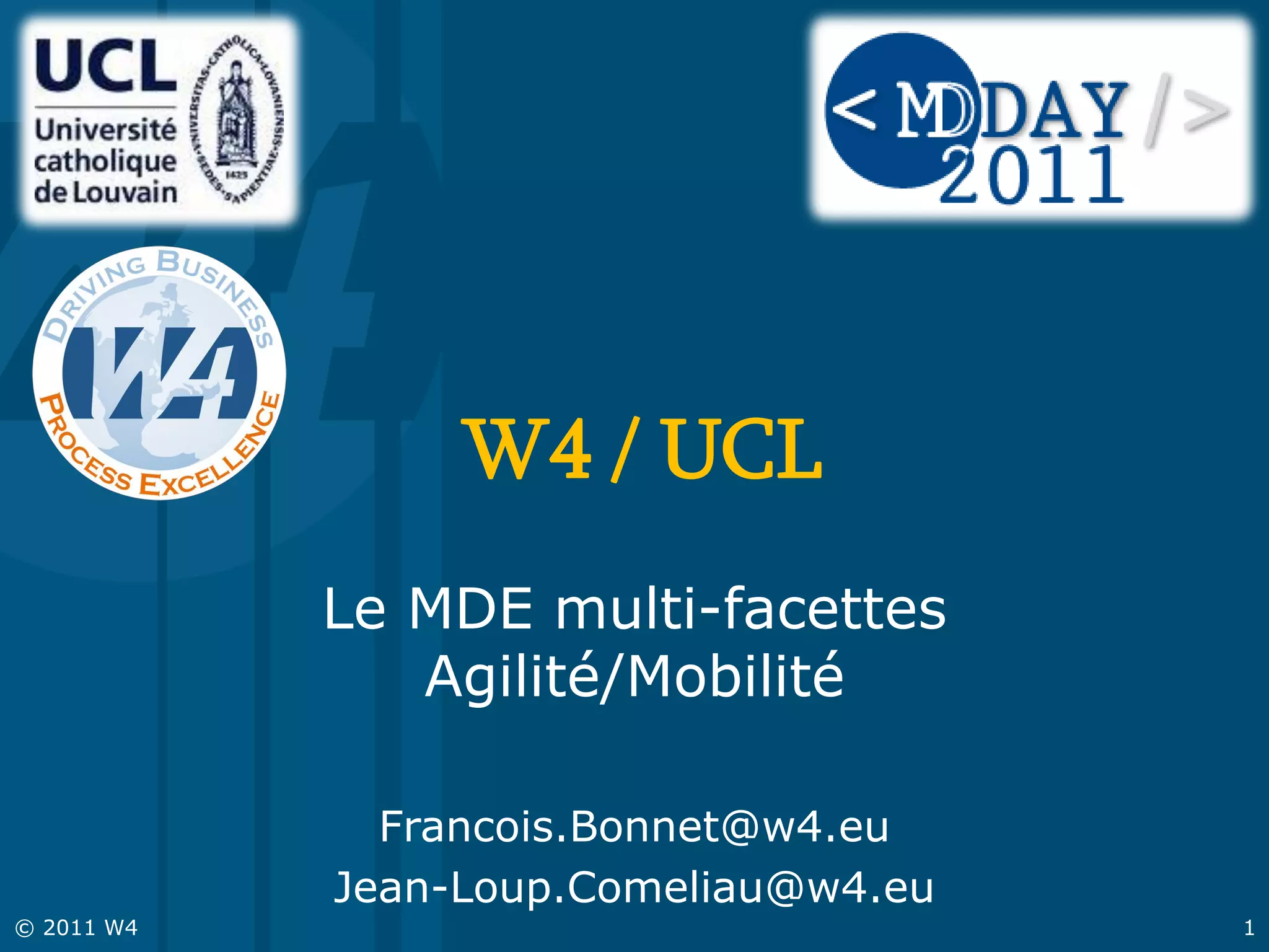 Le document présente W4, un éditeur français spécialisé dans le Business Process Management (BPM) et le Model Driven Engineering (MDE), mettant en avant ses contributions à l'agilité, la mobilité et le cloud. Il explore les approches de génération et d'interprétation dans le MDE, soulignant que le choix dépend du contexte et des compétences de l'équipe. Enfin, W4 propose des solutions mobiles adaptatives et sans effort supplémentaire pour les utilisateurs.