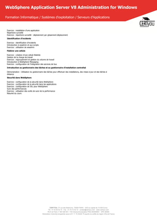 La formation sur l'administration de WebSphere Application Server v8 permet aux participants d'acquérir des compétences pour installer, configurer et gérer le serveur dans des environnements autonomes ou en grappes. Les sujets abordés incluent l'assemblage d'applications Java EE, la sécurité et l'utilisation de divers outils d'administration. Destinée aux administrateurs, développeurs et webmestres, cette formation dure 5 jours avec un coaching disponible après le cours.