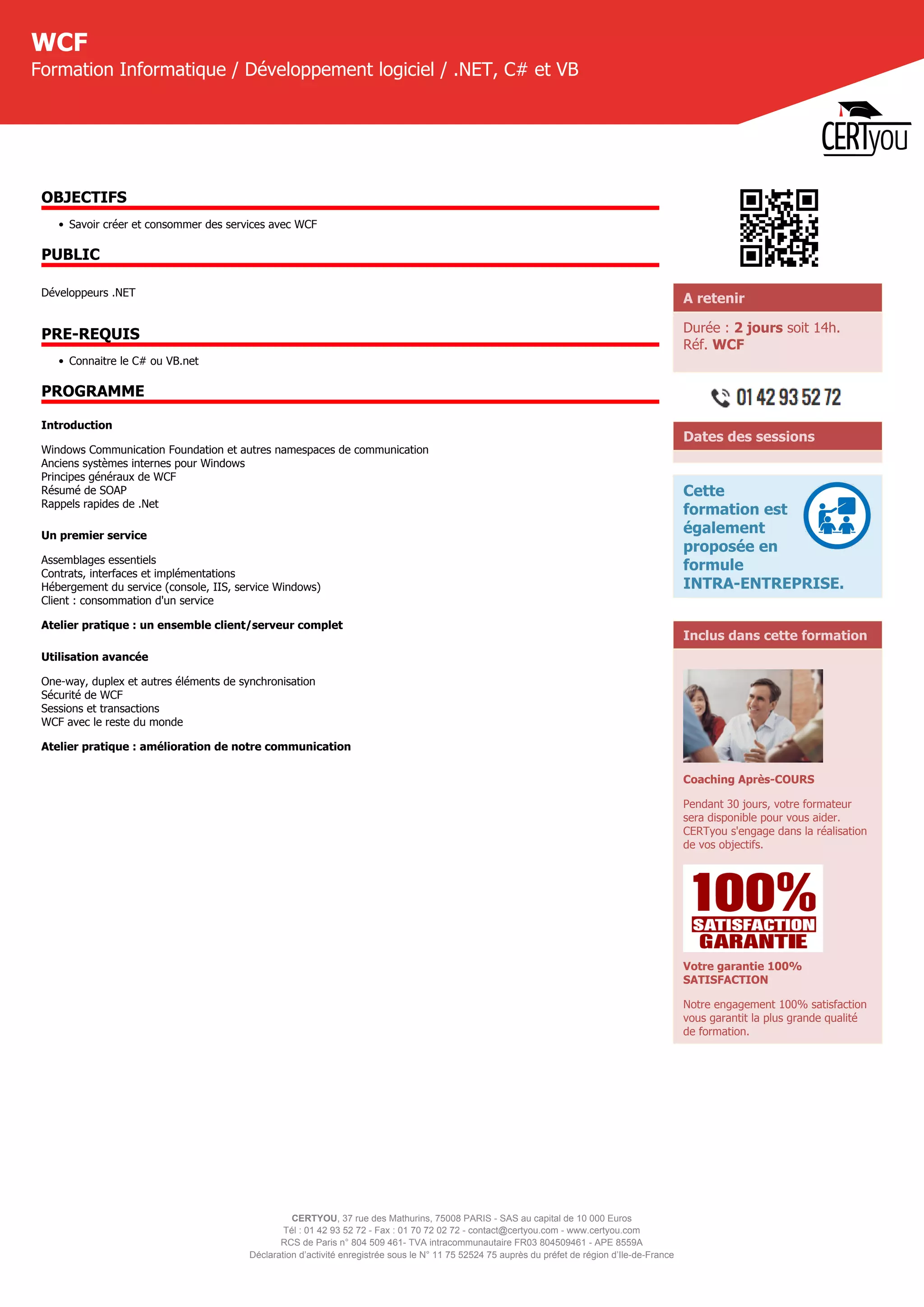 Certyou propose une formation de 14 heures sur Windows Communication Foundation (WCF) pour les développeurs .NET, couvrant la création et la consommation de services. Le programme comprend des ateliers pratiques et un coaching post-formation de 30 jours. Certyou garantit une satisfaction à 100% pour ses formations.