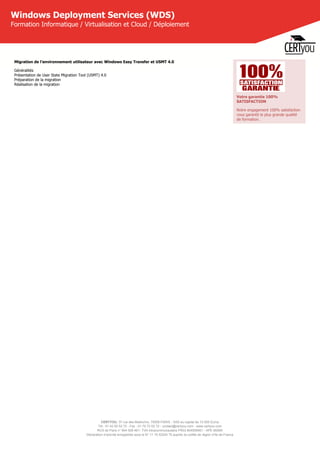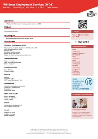Certyou propose une formation sur les Windows Deployment Services (WDS) axée sur le déploiement et la configuration de postes, incluant un coaching de 30 jours après le cours. La formation dure 3 jours avec plusieurs sessions programmées dans différentes villes françaises. Les prérequis incluent des connaissances en administration de Windows Server et la formation vise à maîtriser le fonctionnement et l'utilisation de WDS pour le déploiement de systèmes d'exploitation.