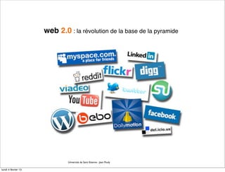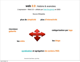 Le document traite de l'évolution du Web 2.0, en mettant l'accent sur sa simplicité, interactivité et le contenu généré par les utilisateurs. Il aborde également des enjeux tels que le crowdsourcing, l'indexation et les impacts sur la vie réelle, y compris des risques de désocialisation et d'addiction. Enfin, il questionne la véritable production de contenu par les utilisateurs et les bénéfices associées à cette nouvelle consommation numérique.