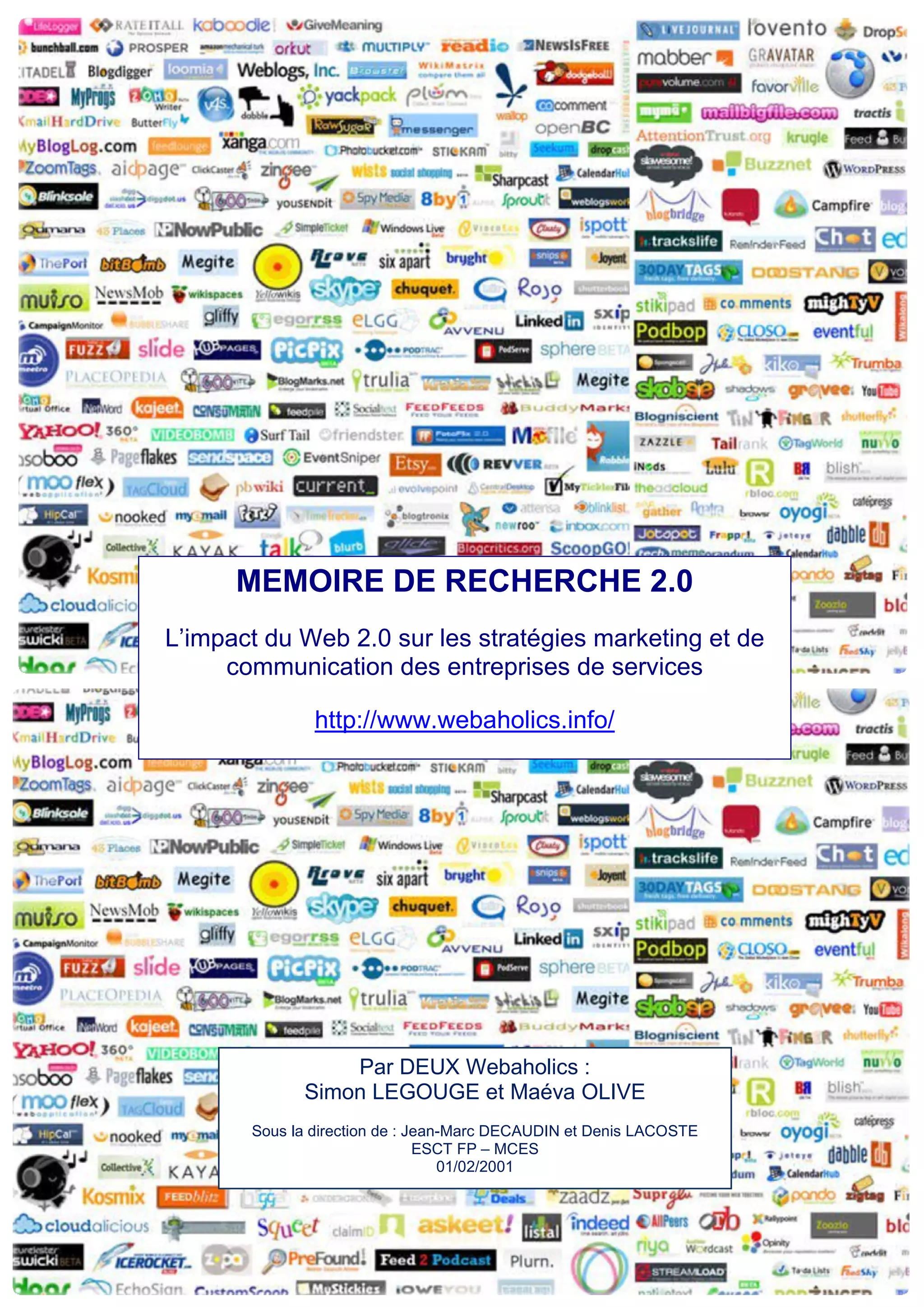 Le document analyse l'impact du Web 2.0 sur les stratégies marketing et de communication des entreprises de services, mettant en évidence l'évolution vers une économie où l'interaction et le partage des consommateurs, appelés 'consoma'cteurs', deviennent cruciaux. Il souligne que les entreprises doivent s'adapter en écoutant les besoins des clients, et explore les nouvelles méthodes de marketing comme le marketing viral et le community management. Le mémoire présente également les opportunités et les dangers liés à cette nouvelle forme de communication.