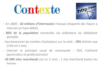 Le document souligne l'importance de la web analytics pour comprendre le comportement des internautes et optimiser les performances des sites marchands en France, où 78% des utilisateurs achètent en ligne. Il décrit les différents types d'analyses nécessaires pour améliorer les taux de conversion et le retour sur investissement, ainsi que les outils et KPI essentiels. Enfin, il évoque Google Analytics et d'autres solutions pour mesurer le succès et maximiser les profits en ligne.