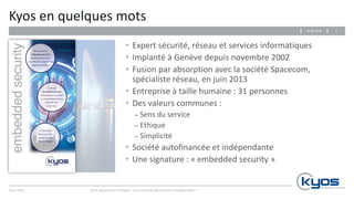Le document présente les solutions de la société Kyos en matière de sécurité, notamment les pare-feu d'application web (WAF) essentiels pour protéger les applications contre diverses cybermenaces. Il souligne l'importance de doter les entreprises d'outils de sécurité adaptés, mettant en avant des initiatives de collaboration et de flexibilité dans l'utilisation des technologies. Le texte aborde également les enjeux de sécurité applicative, plaidant pour une approche proactive dans la gestion des risques liés aux applications numériques.