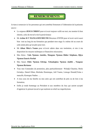 Ce document traite de la sécurité des applications web, en abordant des thèmes tels que les menaces, les vulnérabilités et les principes fondamentaux de la sécurité, incluant l'authentification et la confidentialité. Il présente également la société 'Premiers Pas Sarl', spécialisée en ingénierie informatique et conseils, qui met l'accent sur le développement des systèmes d'information et la sécurité des données. Enfin, il souligne l'importance d'une approche holistique pour la sécurité, englobant à la fois les technologies et la sensibilisation des utilisateurs.