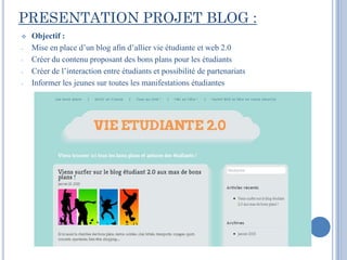 Le projet 'Vie Étudiante 2.0' consiste à créer un blog pour relier la vie étudiante au web 2.0, avec des contenus engageants pour les étudiants, comme des bons plans et des informations sur les événements. Les actions entreprises incluent la création du blog sur WordPress, la rédaction d'articles et l'établissement de liens vers d'autres plateformes. Les futures tâches prévoient la mise en place de fonctionnalités interactives telles qu'un forum et un agenda des événements.