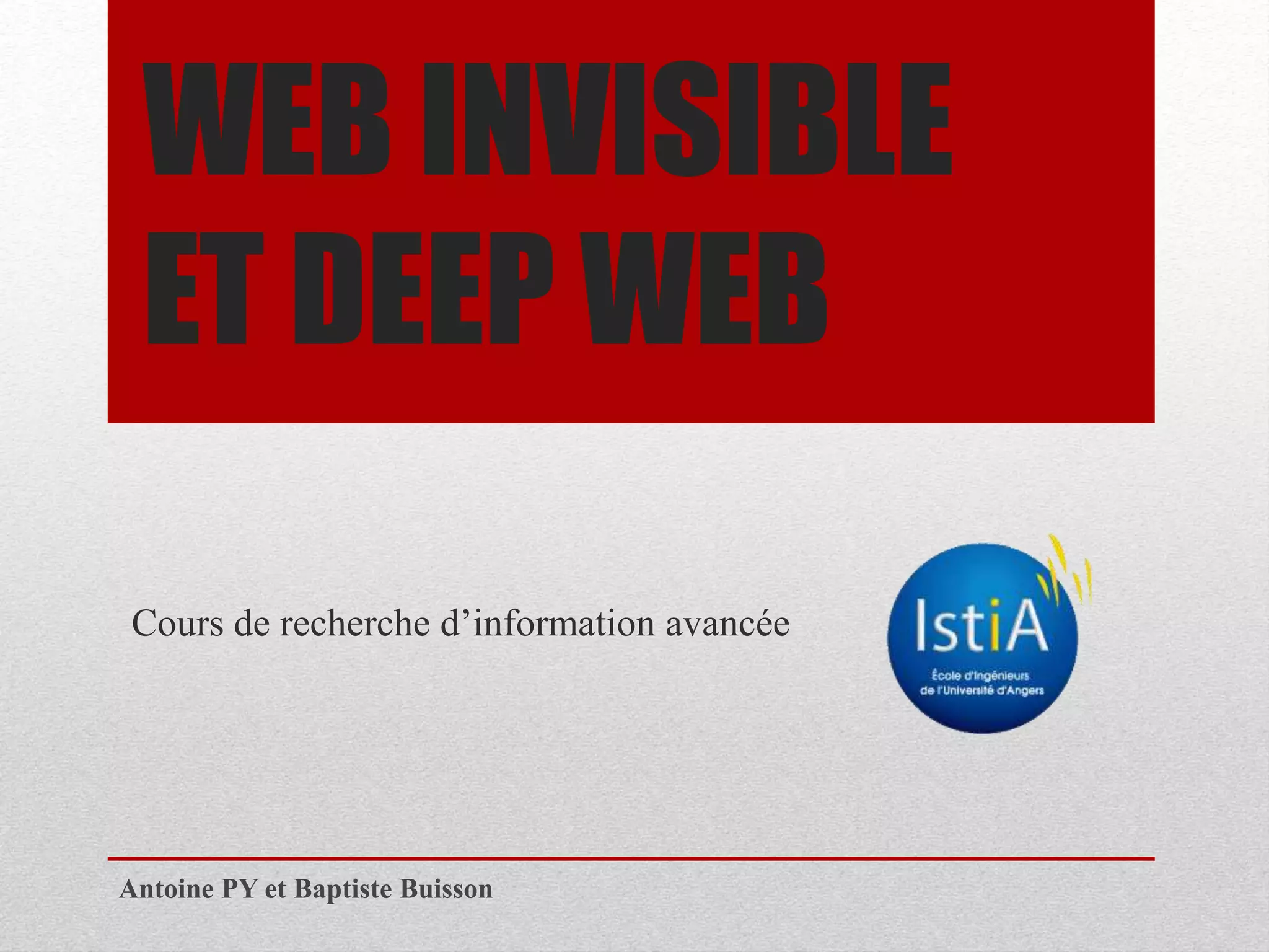 Le document traite du web invisible, qui comprend les pages non-indexées par les moteurs de recherche traditionnels, et décrit ses quatre niveaux d'invisibilité. Il explique également l'évolution du web, l'importance des bases de données et les outils nécessaires pour naviguer efficacement dans cet univers caché. Enfin, il fait la distinction entre le deep web et le dark web, tout en fournissant des ressources pour approfondir la recherche d'informations en ligne.