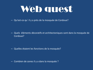 Le document examine la mosquée de Cordoue en soulignant ses éléments architecturaux et décoratifs variés, ainsi que ses fonctions historiques, notamment son rôle comme lieu de coexistence religieuse. Il évoque également la mosquée aljama de Séville, qui est construite sur un site ancien, et incite à une réflexion sur la cohabitation pacifique des différentes cultures. Enfin, il aborde la symbolique de la cour comme espace de beauté et de rencontre.