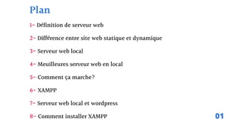 Le document présente un guide sur les serveurs web, incluant leur définition, la différence entre sites web statiques et dynamiques, et la configuration d'un serveur web local. Il aborde également l'utilisation de XAMPP pour le développement de sites, notamment sous WordPress, et fournit des étapes pour son installation. Enfin, le document répertorie divers serveurs web locaux recommandés et présente leur fonctionnement.