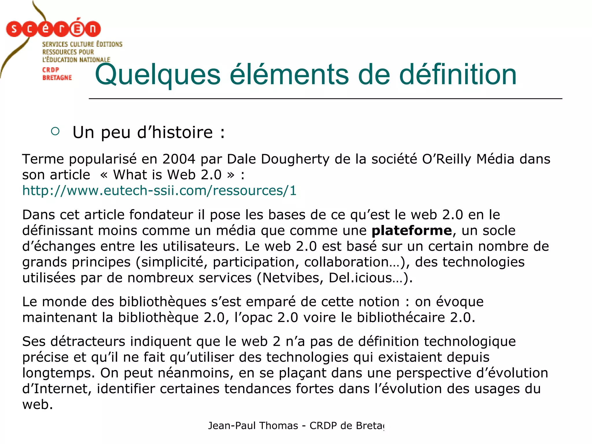 Le Web 2.0, popularisé en 2004, est défini comme une plateforme d'échanges entre utilisateurs favorisant la collaboration et la participation, en opposition à la logique traditionnelle du Web statique. Il repose sur des technologies comme RSS et XML, et se décline en divers services tels que blogs, réseaux sociaux et outils de partage. Les enjeux de l'identité numérique et la nécessité de gérer ses traces en ligne deviennent cruciaux dans un environnement où les utilisateurs laissent de plus en plus d'informations personnelles.