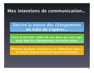 La présentation aborde les changements engendrés par l'open government, notamment l'importance de la transparence, de l'innovation et de l'engagement citoyen. Elle décrit le rôle des gestionnaires de communautés dans la co-création avec les citoyens et les nouvelles fonctionnalités des données ouvertes. Enfin, elle évoque les résistances culturelles au sein des organisations gouvernementales face à ces transformations.