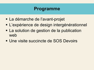 Le document présente un projet de développement d'un site web jeunesse par la ville de Montréal, visant à améliorer l'accès à l'information et aux ressources pour les jeunes. Il inclut des méthodologies de design intergénérationnel et des analyses des pratiques existantes, tout en soulignant l'importance de la participation des jeunes et des bibliothécaires dans le processus. Les objectifs principaux sont de promouvoir la lecture, la littéracie, et d'offrir des ressources accessibles et pertinentes aux jeunes utilisateurs.