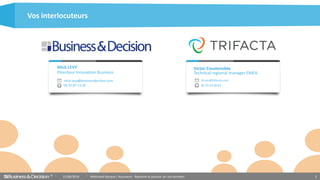 Le webinaire sur la banque et l'assurance aborde la transformation digitale et l'exploitation des données pour améliorer les services. Business & Decision propose des solutions big data pour valoriser les données via des services de préparation et d'analyse. Les cas d'usage incluent l'analyse des comportements clients et la conformité réglementaire, soulignant l'importance de la préparation des données pour maximiser les opportunités métiers.