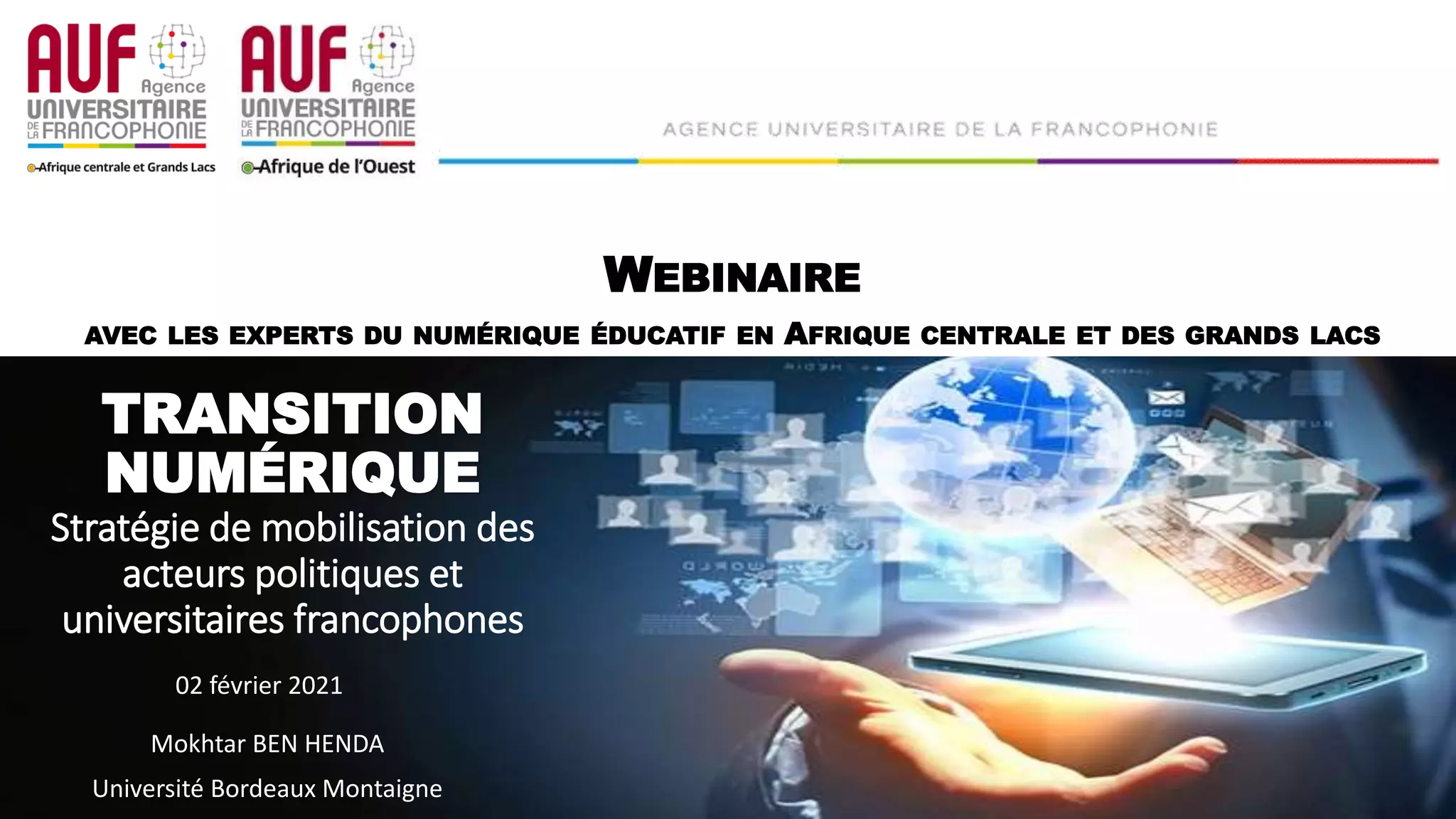 Le document présente une stratégie de transition numérique pour améliorer l'écosystème éducatif en Afrique francophone, en se concentrant sur des volets réglementaires, économiques, technologiques et pédagogiques. Il insiste sur l'importance d'une analyse préalable des besoins et d'une mise en œuvre pragmatique à travers des webinaires de sensibilisation et l'utilisation d'outils technologiques variés. Les défis à relever incluent l'accès à Internet, la massification de l'e-learning et le développement des compétences nécessaires pour un enseignement à distance efficace.