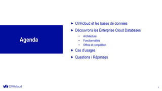 Le webinaire présente les bases de données Cloud d'entreprise d'OVHcloud, en détaillant leur architecture, fonctionnalités, et options de déploiement, notamment les services managés et non managés. Il aborde également les défis associés à la gestion de bases de données, tels que la disponibilité, la sécurité et la performance, ainsi que les solutions offertes par OVHcloud pour répondre à ces besoins. Des cas d'usage sont partagés, illustrant comment les clients peuvent bénéficier de ces solutions dans divers scénarios, tels que les migrations et le déploiement d'applications critiques.