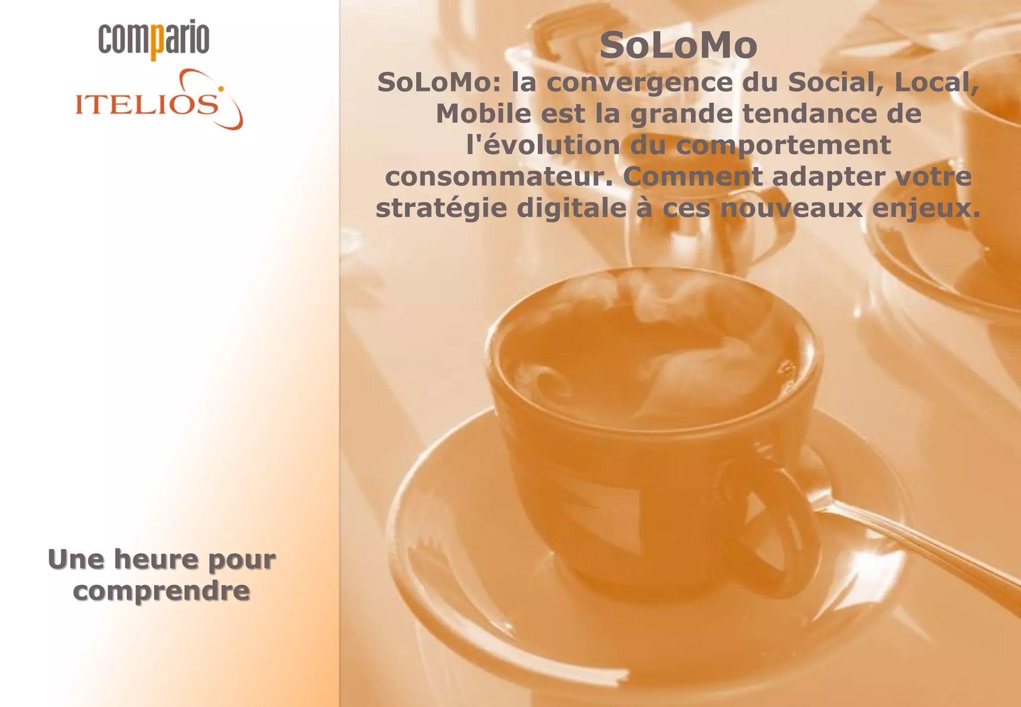 Le document aborde la convergence des dimensions social, local et mobile (SoLoMo) dans le comportement des consommateurs et la manière d'adapter les stratégies digitales en conséquence. Il présente également les expertises de Compario et Itelios dans l'amélioration de l'expérience client à travers des solutions cross-canal. Des statistiques illustrent l'importance de l'interconnexion des canaux, soulignant que les consommateurs utilisent de plus en plus de dispositifs pour leurs achats.