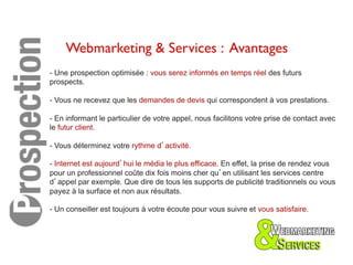 Webmarketing & Services propose des solutions de prospection optimisée pour les professionnels du service à domicile, en facilitant la prise de contact avec des prospects ciblés. Depuis 2005, ils fournissent des outils efficaces pour développer le chiffre d'affaires sans engagement d'abonnement. Leur service s'étend au niveau national et international, permettant une prospection à moindre coût par rapport aux méthodes traditionnelles.