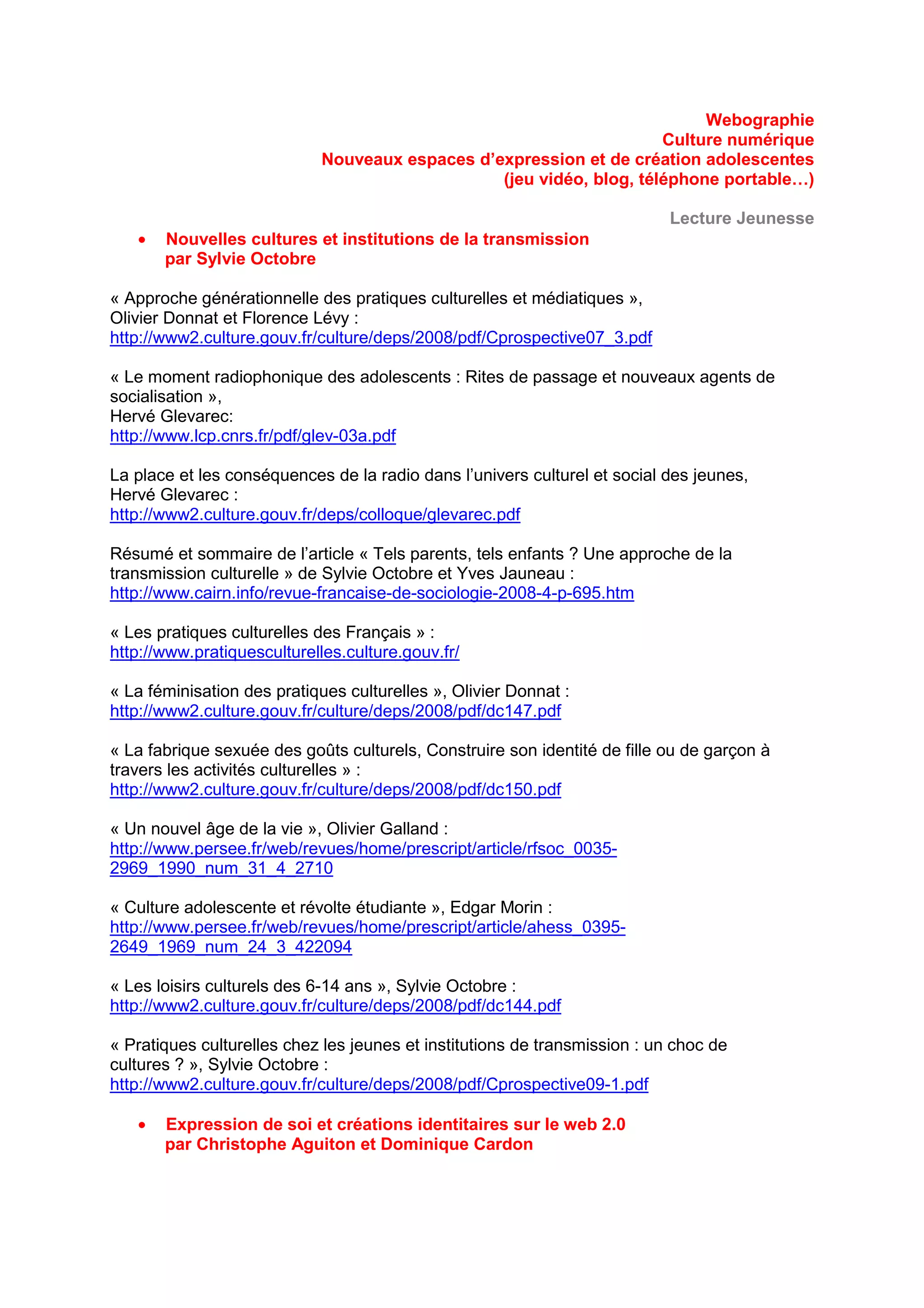 Le document explore les nouvelles pratiques culturelles et médiatiques des adolescents à travers divers médiums tels que les jeux vidéo, les blogs et les réseaux sociaux. Il propose une webographie enrichie de ressources et d'analyses sur la culture numérique et son impact sur l'identité et l'expression des jeunes. Enfin, il aborde le rôle des bibliothèques et des plateformes en ligne comme soutiens à la création littéraire et aux loisirs culturels des adolescents.