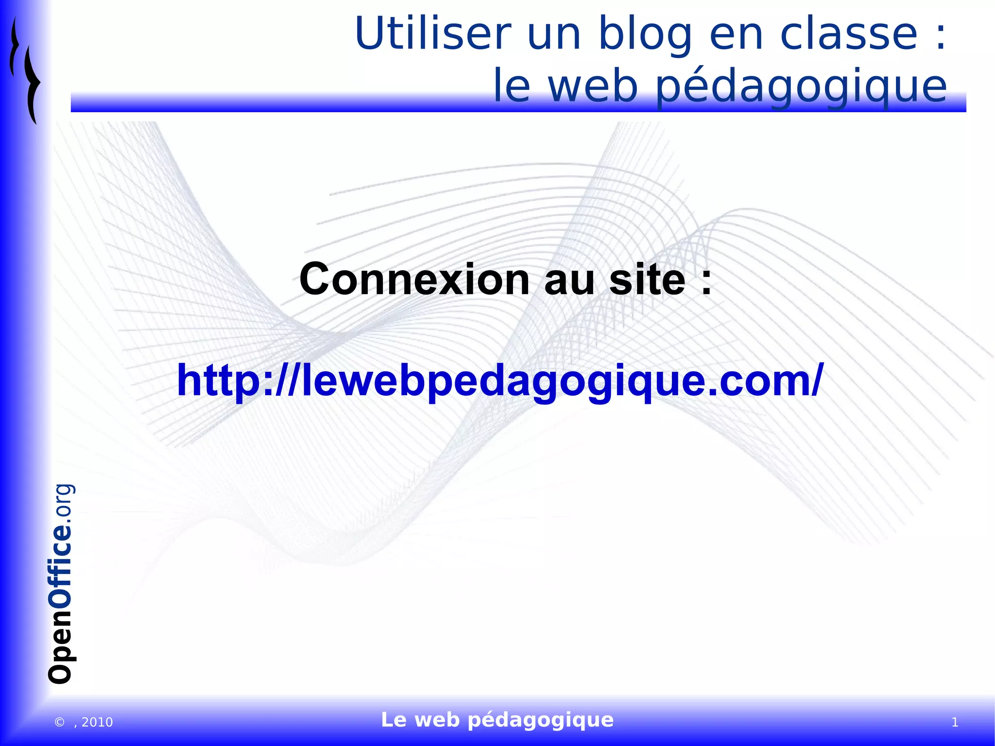 Le document fournit des instructions pour se connecter au site lewebpedagogique.com et utiliser un blog en classe. Il explique comment s'identifier en tant qu'utilisateur et accéder au tableau de bord. Des options pour gérer le blog et créer un article sont également mentionnées.